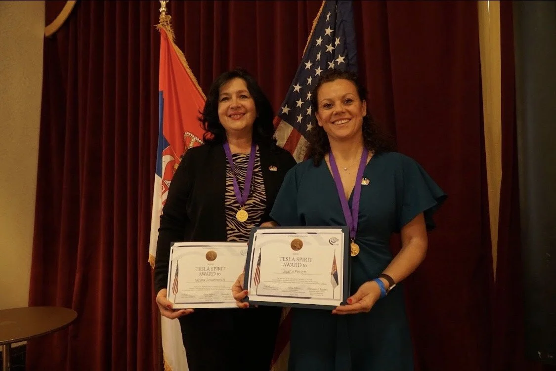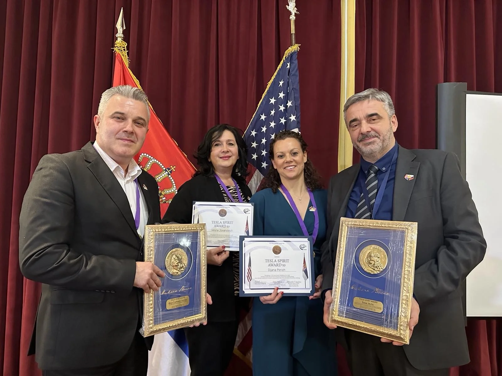 At the Tesla Conference in New York 2023, the Tesla Science Foundation USA presented awards to our members Dijana Peric and Vesna Jovanovic-Mladjenovic, as well as the Nikola Tesla Club San Diego and the School of Serbian Language and Culture San Diego. On behalf of the Tesla Science Foundation USA, the award was presented by Ashley Redfearn, Executive Director of TSF, and Aleksandar Ignjatovic, Project Coordinator of TSF.
